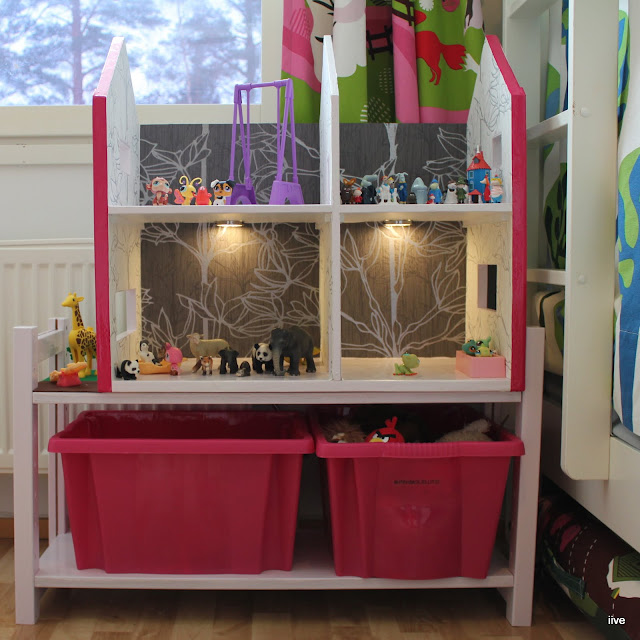 Miehen työpisteellä tapahtui myös, sillä vanhat laatikot saivat maalia pintaan ja teipistä kuvioita. Ja on noissa tyhjissäkin kohdissa kolmioita, ovat vain mustia eivätkä valokuvassa näy.